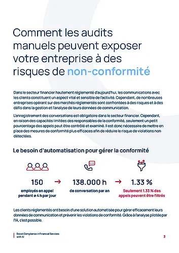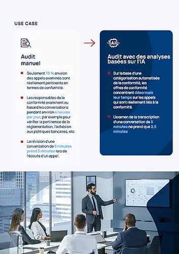 L'IA révolutionne l'analyse des conversations. L'utilisation de l'IA permet aux entreprises d'économiser à la fois du temps et de l'argent, tout en réduisant le risque d'enfreindre les règles de conformité ou de passer à côté de signaux importants. L'IA est en mesure de surveiller, d'évaluer et d'améliorer la qualité et l'efficacité des conversations, tout en fournissant un retour d'information et des connaissances précieuses à toutes les parties concernées.